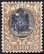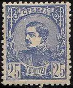 У 1902 році король Олександр І Обренович замовив у Парижі серію марок зі своїм портретом. Цей малюнок часто перероблявся, тому замовлення було виконане тільки в 1903 році. Однак в цьому ж році стався палацовий переворот, в результаті якого Олександр І Обренович був убитий. Надруковані марки з його портретом були випущені в обіг в червні 1903 року, а сам портрет був прикритий надпечаткою — сербським гербом[4].