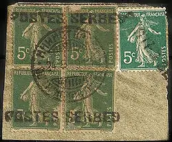 У 1915 році після окупації Сербії австро-угорськими військами сербська армія і уряд були евакуйовані на грецький острів Керкіра (Корфу). Тут для сплати урядової кореспонденції з 1916 року використовувалися марки Франції. Після здачі поштового відправлення в поштове відділення на марках або поруч з ними ставилася надпечатка фр. «Postes Serbes» («Сербська пошта»). Марки були вилучені в 1918 році за вимогою Франції. В кінці Першої світової війни було виготовлено невелику кількість примірників для колекціонерів.