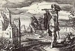 | Однак, щоб залишити свої астрономічні доводи і справи, мій батько з його постійною, важкою, старанною, діяльністю, за допомогою математичних доказів і доводів зміг, багаторазово збільшити видимість, розташувавши окуляри пропорційно належним чином під певним кутом і зміг не тільки виявити предмети розташовані далеко, перечитати напис на кожній монеті, кинутої друзями по спільній справі на відкрите поле, але й він міг бачити що відбувається у відокремлених місцях за сім миль.. |