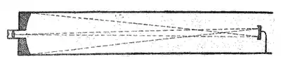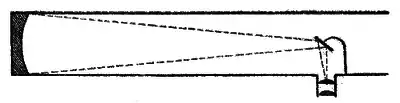 Це унікальне доповнення дозволило отримати зображення з мінімальною обструкцією дзеркала об'єктива. Перший компактний телескоп-рефлектор Ньютона мав дзеркало діаметром 1,3 дюйма і фокусну відстань F/5.[34] З його допомогою він міг бачити чотири «супутники Галілея» Юпітера і фазу планети Венера. Натхнений цим успіхом, він зробив другий телескоп зі збільшувальною потужністю 38x, який він представив у Королівському товаристві в Лондоні, в грудні 1672. Цей тип телескопа досі називають ньютонівський телескоп. Третя форма дзеркального телескопа, «відбивач Кассегрена» був розроблений в 1672 році Лораном Кассегреном. Телескоп мав невелике опукле гіперболоїдне вторинне дзеркало, яке поміщається поряд з первинним фокусом, щоб відбивати світло, яке проходило через центральний отвір в головному дзеркалі. Ніяких практичних просувань в конструкції рефлекторних телескопів впродовж 50 років не було, доки Джон Хедлі (найбільш відомий як винахідник октанта) не розробив спосіб зробити точні асферичні і параболічні рефлекторні металеві дзеркала. У 1721 році він показав перший параболічний відбивач ньютона в Королівському Науковому Товаристві.[35] Він мав 6 дюймів (15 см) в діаметрі, 62 3/4 дюйма (159 см) фокусну відстань рефлекторного металевого дзеркала об'єктива. Прилад був розглянутий Джеймсом Фунтом і Джеймс Бредлі.[36] Після того, як помітили, що телескоп Ньютона лежав знехтуваний протягом п'ятдесяти років, вони заявили, як показав Хедлі, що винахід не складається з однієї теорії. Вони порівняли його продуктивність з 7,5 дюймовим (190 мм) повітряним телескопом, який був спочатку представлений в Королівському Науковому товаристві Константином Гюйгенсом молодшим.