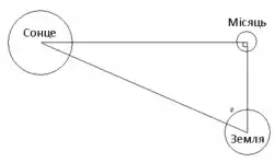 Подальший розвиток тригонометрії пов'язаний з ім'ям астронома Аристарха Самоського (III століття до н. е.). В його трактаті «Про величини і відстані Сонця і Місяця» була поставлена задача про визначення відстаней до небесних тіл; ця задача потребувала обчислення співвідношення сторін прямокутного трикутника при відомому значенні одного з кутів. Аристарх розглядав прямокутний трикутник, утворений Сонцем, Місяцем і Землею під час квадратури. Йому було потрібно обчислити величину гіпотенузи (відстань від Землі до Сонця) через катет (відстань від Землі до Місяця) при відомому значенні прилеглого кута (87°), що є еквівалентом обчислення значення . За оцінкою Аристарха, ця величина лежить у проміжку від 1/20 до 1/18, тобто відстань до сонця у 20 разів більше, ніж до Місяця[10]; насправді Сонце знаходиться майже у 400 разі далі, ніж Місяць, помилка виникла через неточність у вимірюванні кута. Водночас Аристарх довів нерівність, яка у сучасних термінах передається формулою: