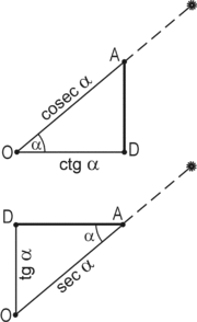 Серед праць, що збереглися, найбільш ранні належать аль-Хорезмі та аль-Марвазі (IX століття), які розглянули, разом з відомими це індійцям синусом і косинусом, нові тригонометричні функції: тангенс, котангенс, секанс і косеканс[32]. Спершу ці функції визначались інакше, між у сучасній математиці. Так, під котангенсом розуміли довжину тіні від вертального гномона висотою 12 (іноді 7) одиниць; спочатку ці поняття використовувались для розрахунку сонячних годин. Тангенсом називали тінь від горизонтального гномона. Косекансом і секансом називали гіпотенузи відповідних прямокутних трикутників (відрізки АО на малюнку праворуч)[45]. Лише у X столітті філософ і математик аль-Фарабі в своїх коментарях до «Альмагеста» ввів незалежні від гномоніки визначення цих чотирьох функцій, визначивши їх через синус і косинус в тригонометричному колі з птолемеївським радіусом (60 одиниць). Основні співвідношення між всіма шістьма функціями навів аль-Баттані у тому ж сторіччі. Кінцевої уніфікації домігся Абу-л-Вафа у другій половині X століття, який вперше використав для визначення тригонометричних функцій коло з одиничним радіусом, як це робиться у сучасній математиці.
