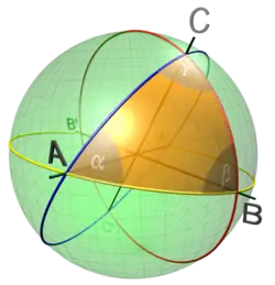 Пояснимо, що в сферичній геометрії прийнято вимірювати сторони трикутника не лінійними одиницями, а величиною центральних кутів, що на них спираються. В сучасній сферичній геометрії наводяться ще два співвідношення: