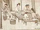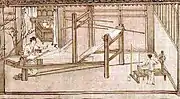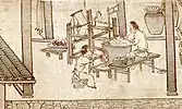 Більш детальна інформація існує про ткацькі верстати. Трактат «Nung Sang Chi Yao» («Основи землеробства і шовківництва»), складений близько 1210 року, насичений малюнками і описами, які відносяться до шовку.[28] В ньому неодноразово стверджується, що китайську верстати далеко перевершують всі інші. Він говорить про два види ткацьких верстатів, які залишають робочі руки вільними: кегельний (ручний) ткацький верстат, який має євразійське походження, і педальний (ножний) ткацький верстат, який має східноазійське походження. Існує багато зображень схем верстатів 12-го і 13-го століть. Якщо придивитися, можна побачити багато спільного між різними верстатами євразійського типу. З часів династії Цзінь, існування шовкового дамасту добре зафіксоване, а з 2-го століття до н. е. чотири-ремізні ткацькі верстати і інші інновації дозволили створити шовкову парчу.