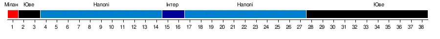 | Ювентус | 2-0 | 2-1 | 3-1 | 3-0 | 3-0 | 3-0 | 1-0 | 1-0 | 0-0 | 1-2 | 3-1 | 0-1 | 1-0 | 3-0 | 7-0 | 4-1 | 4-0 | 2-0 | 2-1 | |