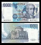 10 000 лір | Синій-фіолетовий | 133 х 70 | Портрет А. Вольта і модель Вольтова стовпа | Зображення усипальниці Вольти в Комо | |