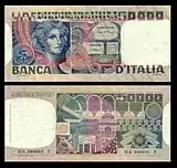50 000 лір | Червоний | 149 х 70 | Портрет Л. Берніні, на фоні фрагмента фонтану «Тритон» | Зображення кінної статуї імператора Костянтина | 1984 |