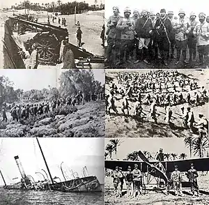 ![]() За годинниковою стрілкою зверху зліва: батарея італійських гармат 149/23; Мустафа Кемаль з османським офіцером і лівійськими моджахедами; Італійські війська висаджуються в Триполі; італійський літак Blériot; Османський канонерський човен Bafra тоне в Ель-Кунфудхе; Османські полонені на Родосі. За годинниковою стрілкою зверху зліва: батарея італійських гармат 149/23; Мустафа Кемаль з османським офіцером і лівійськими моджахедами; Італійські війська висаджуються в Триполі; італійський літак Blériot; Османський канонерський човен Bafra тоне в Ель-Кунфудхе; Османські полонені на Родосі. | |||||||