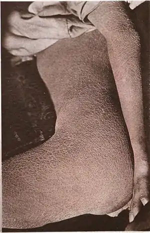 ![]() Тіло людини, ураженої іхтіозом Тіло людини, ураженої іхтіозом | |