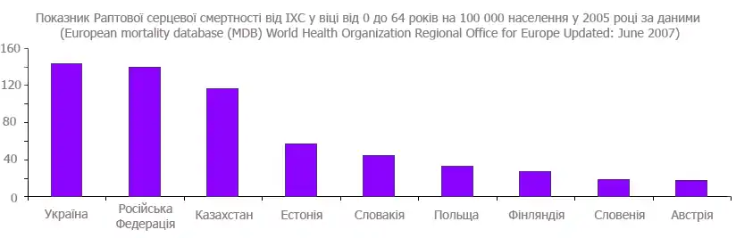 Ішемічна хвороба серця в Україні займає провідні позиції в структурі причин смертності від захворювань. За даними Всесвітньої організації охорони здоров'я (2005 р.) серед країн Європейського Союзу, країн СНД, та інших європейських країн — Україна посідає одне з перших місць серед смертності населення від ІХС. Так, наприклад, за показником Раптової серцевої смертності від ІХС у віці від 0 до 64 років на 100 000 населення — Україна посідає перше місце серед цих країн (143,78 / 100 000 населення). Див. порівняльну діаграму.