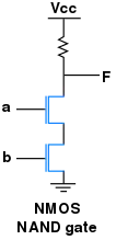 Для реалізації функції NAND нормально-замкнені контакти обох реле з'єднуються паралельно. Якщо не активоване хоча б одне реле, то струм проходитиме через його контакт. Якщо активувати обидва, ланцюг струму буде розірвано, тобто струм не проходить, коли спрацювало реле А і реле B.