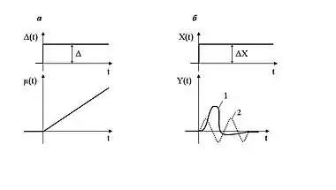 На рис. 1 а показана перехідна функція І-регулятора. Ці регулятори характеризуються відсутністю в стані рівноваги однозначної залежності між значенням регульованого параметра і положенням регулюючого органу, що обумовлено відсутністю зворотного зв'язку.