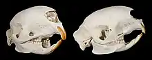 Череп із видовженим лицьовим і укороченим потиличним відділом — відстань від середини лобно-тім'яного шва до середини потиличного гребеня менша третини основної довжини черепа. Верхня поверхня черепа помітно надута, лінія профілю опукла. Лобні кістки коротші за носові. Задній край носових кісток доходить до рівня передньо-горішніх кутів очних ямок, а найбільша ширина кожної кістки значно перевищує половину ширини лобової кістки. Ширина слухових барабанів не буває меншою за їхню довжину, і є зазвичай рівною або трохи більшою. Довжина нижньої діастеми не менша за зовнішню альвеолярну довжину P4-M2.[11]