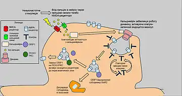 Алостеричними модуляторами є речовини, що змінюють активність АМРА-рецептора шляхом зміни перебігу процесів деактивації та десенситизації[106]. Зв'язування агоніста з LBD спричиняє виникнення напружень у рецепторній молекулі, котрі може бути знято двома шляхами: відкриттям іонного каналу (активація рецептора), або зміною конформації молекули на таку, де канал закритий, але напруження відсутні (десенситизація рецептору). У першому випадку після дисоціації ліганд-рецепторного комплексу іонний канал закривається, а рецептор переходить до ненапруженої конформації (деактивація) (див. Рисунок 5). Позитивні модулятори АМРА-рецептору (наприклад, пірацетам[107] ) зв'язуються з LBD, переводячи його в конформацію, транзит якої до ненапруженого стану після зв'язування з агоністом потребує більшої енергії, ніж у незв'язаному з модулятором стані; таким чином, модулятори запобігають десенситизації рецептора. Деякі з модуляторів також здатні уповільнювати або прискорювати дисоціацію комплексу агоніст-рецептор; таким чином відбувається модуляція процесу деактивації.