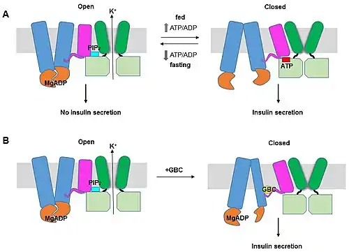 Для відкриття KATP-каналів потрібна наявність молекул фосфатидилінозитол-4,5-біс-фосфату у клітинній мембрані поблизу каналу[10].