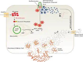 Головна функція KATP-каналів в ендокринній частині підшлункової залози — це секреція інсуліну. Інсулінова секреція активується високим рівнем глюкози в крові. Під час допорогового рівня глюкози KATP-канали відкриті та підтримують негативний електрохімічний потенціал. У момент, коли рівень глюкози у крові зростає, глюкоза входить до клітини через глюкозний транспортер GLUT2 і запускається її метаболізм у β-клітинах острівців Лангерганса. Як наслідок у клітині зростає рівень АТФ, а рівень АДФ падає. Слідом за цим KATP-канали закриваються, клітини деполяризуються та відбувається активація потенціалзалежних кальцієвих каналів (ПЗКК). Приток кальцію веде до того, що пухирці, які містять інсулін, зливаються з мембраною та гормон таким чином вивільняється назовні.[18]