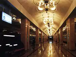 Станція має два підземних вестибюлі. В оформленні залу станції використані чотиригранні колони з ажурними ґратами. Над входом на ескалатор встановлено вітраж.