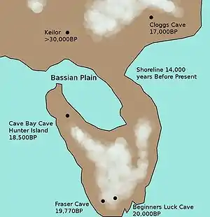 На думку вчених, Тасманію заселили близько 35 000 років тому. До цього періоду відносять найдавнішу стоянку, знайдену археологами на острові (на середину 2010-х)[11]. Деякі дослідники відсувають цю дату до 40 000 років тому. Характер знайдених ранніх предметів, а також зіставлення мов аборигенів Центральної та Східної Тасманії з мовою австралійських аборигенів Нового Південного Уельсу свідчать про те, що переселення відбулося з Австралії[12][13]. Хоча міграція людей сучасного типу з Азії до Австралії вимагала наявності навичок мореплавання, більшість учених схиляється до думки, що переселення з Австралії Тасманії відбувалося по суші, оскільки немає доказів, що тасманійці до приходу європейців вміли виробляти судна, гідні для плавання на великі відстані. У період останнього льодовикового періоду рівень океану був значно нижче і на місці сучасної Бассової протоки існував сухопутний міст. Ймовірно, його було затоплено не пізніше 8 тисячоліття до н. е. Приблизно в цей час в Австралію потрапили собаки дінго, але в Тасманію інтродукція не відбулась[14].