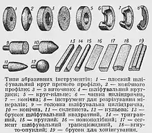 Абразиви звичайно застосовують у вигляді абразивного інструмента (шліфувальні круги, сегменти, головки, бруски, коронки, олівці тощо). Розрізняють природний і штучний абразив. інструмент. Перший виготовляють із кусків гірських порід, другий — із зерен природних або штучних абразивів, зцементованих якою-небудь в'яжучою речовиною. Абразив. інструмент бував об'ємним — мав вигляд тіл різної форми, і площинним — являє собою тонкий шар абразивних зерен, наклеєних на папір або тканину (так звана шкурка). Застосовують його при обдиранні (видалення великої кількості матеріалу) і для утворення дуже точних і тонко оброблених поверхень, а також для одержання точного профілю при зубошліфувальних, різьбошліфувальних, профільношліфувальних роботах. Важливою властивістю абразив. Інструмента в його вдатність до часткового або повного самозагострювання.