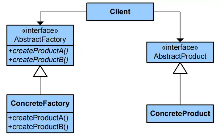 - AbstractFactory передоручає створення об'єктів продуктів своєму підкласу ConcreteFactory.