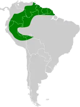Вид поширений на півночі та заході Бразилії, півночі Болівії, в Перу та Еквадорі, на сході Колумбії, півдні Венесуели та у Гвіані. Мешкає у вологих низинних лісах (іноді до 1000 м) та прибережних лісах, переважно на узліссях, де ліс зустрічається з відкритою місцевістю або річкою.