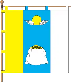 Квадратне полотнище розділене вертикально на три частини - жовту, синю, білу - в співвідношенні 2:3:2. На середній частині жовта арка з білими крилами, під якою білий мішок з жовтими монетами.