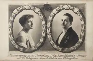 Навесні 1912 у Швейцарії Августа Вікторія познайомилася зі скинутим королем Португалії Мануелем II, який був її далеким родичем. Дівчина глибоко вразила монарха, і наступного року відбулося їхнє весілля. Урочисте вінчання святкували у замку Зігмарінген 4 вересня 1913. Нареченим було по 23 роки. Медовий місяць молодята провели у Мюнхені, після чого оселилися у Фулвелл-Парку в Твікенемі поблизу Лондона. Сімейне життя виявилося щасливим та гармонійним. Дітей у пари не було. Мануел раптово помер 2 липня 1932 року.