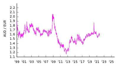 | 1 EUR = | 1,576 AUD (18 лютого 2022) |