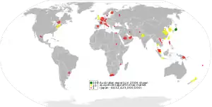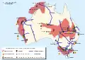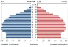 Населення країни становить 25,25 млн осіб[2]. Австралія — країна іммігрантів, які становлять 26 % населення, за цим показником країна посідає 9-те місце у світі[9][10]. Столиця Австралії — місто Канберра — розташоване у спеціально створеній Австралійській столичній території. Найбільше місто — Сідней. Країна високо урбанізована. Населення розміщене дуже нерівномірно: більшість його мешкає на південному сході, у штатах Вікторія та Новий Південний Уельс[2][11]. Близько 60 % населення проживає в найбільших містах та їхніх агломераціях: Сідней Мельбурн, Брисбен, Перт та Аделаїда. Середня густота населення 3,3 особи на км², це найнижчий показник у світі[12]. ![]()