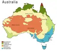 Кліматичні умови в країні обумовлюються розташуванням переважної частини території в тропічному поясі південної півкулі, зміна пір року відбувається обернено до зміни сезонів в Україні[7]. Спекотне літо припадає на період з листопада по січень, прохолодна зима — на червень-серпень. Проте чітка зміна пір року простежується лише на півночі та на півдні, а виражається вона здебільшого в режимі зволоження. Австралія протягом усього року отримує значну кількість сонячної енергії, для всього материка характерні високі температури повітря, середні літні температури +20..+28 °C, середні зимові +12..+24 °C. Найнижчі зафіксовані температури на рівнинах -4..-6 °C, у горах (Австралійські Альпи) -22 °C. Над материком переважає континентальна тропічна повітряна маса й низхідні рухи повітря, що робить Австралію найсухішим континентом на планеті. Більша частина материка розміщена у широтах, де панує південно-східна пасатна циркуляція. І хоча повітряні маси рухаються з Тихого океану, вони не приносять значних атмосферних опадів у внутрішні райони материка, бо Великий Вододільний хребет перехоплює вологу, рясні опади випадають тільки на навітряних схилах гір у вузькій прибережній смузі. На півночі «сезон дощів» припадає на літо, на півдні — на осінь-зиму, на східному узбережжі дощі випадають відносно рівномірно протягом всього року[7]. Близько 40 % материка дістає 50-250 мм опадів на рік і тільки 10 % — понад 1000 до 2000 мм (східне узбережжя)[7]. Крайня посушливість клімату Австралії істотно ускладнює використання земель у господарстві. Кожні 10-15 років в Австралії трапляються великі посухи, що тривають інколи по два-три роки[66][67]. У цей період 2/3 материка дістає менше 25 мм опадів на рік. Проте справжнім стихійним лихом для Австралії є раптові зливи, з перевищенням місячної норми в 10-17 разів, що завдають величезної шкоди сільському господарству: гинуть урожаї та худоба, змивається ґрунт[66][67]. На клімат Австралії суттєво впливають океанічні течії, зокрема диполь Індійського океану та Ель-Ніньйо, які корелюються періодичними посухами та сезонними тропічними системами низького тиску, які утворюють циклони у північній Австралії[66][67].