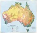 Австралія — найдревніший[20], найпласкіший[21] і найсухіший континент[22][23] з найменш родючими ґрунтами на планеті[24][25]. Величезні розміри країни забезпечують різноманіття ландшафтів з пустелями в центрі, тропічними лісами на північному сході й гірськими хребтами на сході[26][19]. Австралія має багаті, хоча ще не повністю досліджені природні ресурси. ![]()