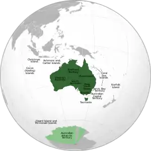 Австра́лія, або Австралі́йський Сою́з, (англ. Commonwealth of Australia[6]) — незалежна федеративна держава, розташована у Південній півкулі на однойменному материку, до якої також належать прилеглий великий острів Тасманія на півдні й численні дрібні навколо, серед яких Норфолк і Лорд-Гав у Тихому океані, Кокосові острови в Індійському та інші[7]. Площа країни становить 7 688 287 км², це 6-те місце серед країн світу і перше серед країн Океанії[1]. Австралія на півночі відділена від Папуа Нової Гвінеї водами Торресової протоки, водами Тиморського і Арафурського морів — від Індонезії та Східного Тимору; на сході — водами Коралового моря від Соломонових Островів, Вануату і Нової Каледонії (Франція); на південному сході — Тасмановим морем від Нової Зеландії[8]. ![]()