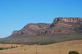 Західна частина — Західно-Австралійське плоскогір'я найдревніша частина континенту; середні висоти 400—500 м, найвища вершина — гора Брус (1236 м)[8]. Воно оточене хребтами і столовими горами Кімберлі, Макдоннелл, Масгрейв, Гамерслі[7]. На висотах 400—600 м знаходяться кам'янисто-щебенисті та піщані рівнини оточені невисокими гірськими грядами та ізольованими платоподібними масивами. На сході плоскогір'я переходить у гірські хребти Макдонелл (гора Зіл, 1510 м) та Масгрейв (гора Вудрофф, 1440 м)[8]. Гора Аугустус у Західній Австралії вважається найбільшим монолітом у світі[59].