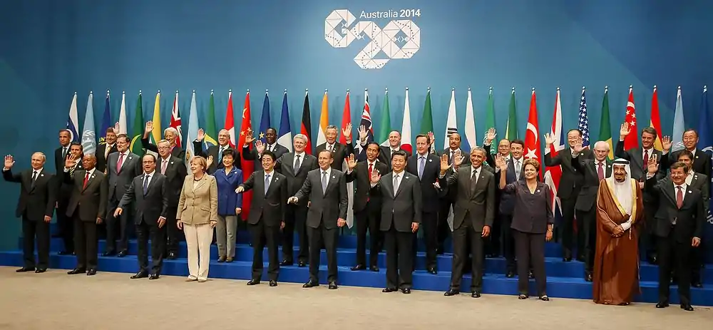 Австралія є членом Організації Об'єднаних Націй (UN), Великої двадцятки (G20), Співдружності Націй, Тихоокеанського пакту безпеки (ANZUS), Організації економічного співробітництва та розвитку (OECD), Форуму тихоокеанських островів (PIF), Світової організації торгівлі (WTO), Азійсько-тихоокеанського економічного співробітництва (APEC), механізму АСЕАН +6. ![]()