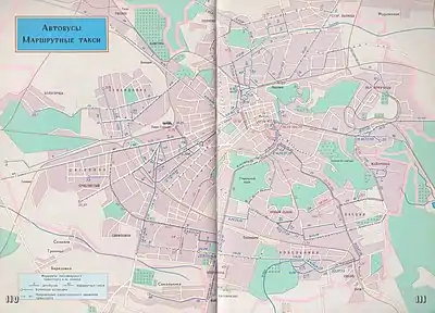 В таблицях подано переілк міських автобусних маршрутів з проміжними зупинками, а також приміських маршрутів, що курсують через місто. Де потрібно, уточнюється розміщення кінцевої зупинки. Курсивом виділені вулиці, де маршрут пролягає лише в одну сторону.