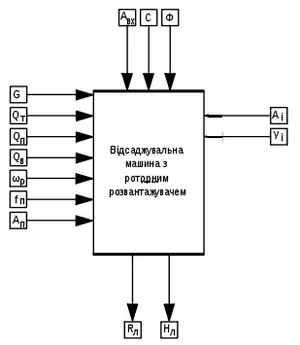 Особливістю сучасної відсаджувальної машини є велике число керуючих впливів. Для прикладу розглянемо відсаджувальну машину з роторним розвантажувачем для збагачення вугілля. Керуючі впливи відсаджувальної машини наведені на рис. 1. До них належить навантаження (G), витрата транспортної і підрешітної води (Qт, Qп), витрата повітря (Qп), частота обертання роторного розвантажувача (wр), частота і амплітуда пульсації постелі (fп, Aп).