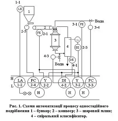 На рис. 1 показано варіант схеми автоматизації, що відповідає поставленим вимогам. Схема включає: САР завантаження млина рудою (система 2), густину пульпи в млині (система 3) і гранулометричний склад зливу класифікатора (система 4).