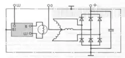 Для випрямлення змінної напруги в корпусі генератора вмонтовано 6 кремнієвих діодів, по 2 на кожну фазу. У деяких моделях генераторів ще встановлюють паралельно до діодів конденсатор.