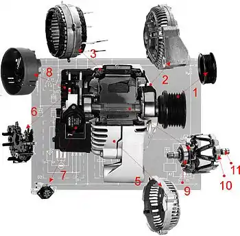 Після вмикання запалювання струм від акумуляторної батареї надходить в обмотку збудження, встановлену на роторі генератора. Під час обертання ротора його магнітний потік перетинає витки обмоток статора, й у них індукується змінний струм, який потім випрямляється й подається в зовнішнє коло. Коли напруга, яку виробляє генератор, перевищуватиме напругу акумуляторної батареї, струм від генератора піде на заряджання батареї та живлення інших споживачів системи електрообладнання. В обмотку збудження генератора в цей час струм також надходить від генератора, а не від акумуляторної батареї.