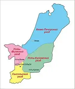 У 1922 область була розділена на 4 повіти: Іжмо-Печорський повіт, Усть-Вимський повіт, Усть-Куломський повіт, Усть-Сисольський повіт. У 1926 році Усть-Сисольский повіт було перейменовано у Сисольський.