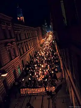 1 травня активісти «Автономного опору» у Львові провели «Соціальний марш». Вони ствердили, що їхньою метою було привернути увагу львів'ян до того, що влада приймає антинародні закони, та закликати людей боротися за свої соціальні права. Колона учасників повинна була пройти за таким маршрутом: пам'ятник Чорноволу на вул. Підвальній — вул. Підвальна — пл. Ринок — пр. Свободи — вул. Гнатюка — пл. Григоренка — вул. Листопадового Чину — пам'ятник Іванові Франку[64].