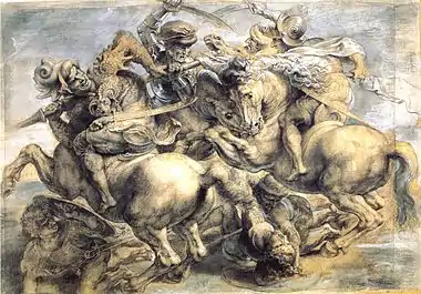 Значущість, велику мистецьку вартість малюнків Леонардо сучасники відчули у Флоренції під час вимушеного мистецького змагання між ним та Мікеланджело Буонарроті. Картон Леонардо до «Битви при Ангіарі» — не що інше, як великий малюнок у повний розмір майбутньої фрески. Навіть за словами Джорджо Вазарі, малюнки-картони Леонардо та Мікеланджело стали школою для молодих художників назавжди. Їх неодноразово копіювали, як визначні зразки досягнень мистецтва Італії, хоча саме фресок створено не було.
