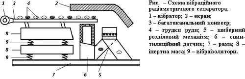 Вихідна руда до датчиків радіометра і сортувальних механізмів подається металевим вібраційним конвеєром, який складається з декількох паралельних жолобів. У кінці конвеєра під кожним жолобом встановлені оточений свинцевим або стальним екраном сцинтиляційний датчик, який реєструє гамма-випромінювання грудок руди при їх вільному падінні з конвеєра, а також розділовий механізм (шибер з електромагнітним приводом). Грудки руди можуть розділятися також пневматичним механізмом. Основною перевагою вібраційного радіометричного сепаратора є його висока продуктивність.