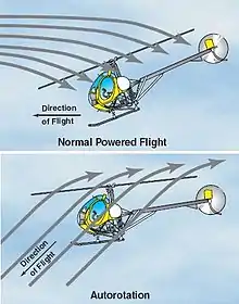 У нормальному польоті з працюючим двигуном повітря втягується в систему несного гвинта згори і спрямовується донизу. Але під час авторотації повітря переміщується у системі гвинта знизу вгору, оскільки вертоліт опускається . Авторотація є можливою механічно внаслідок наявності обгінної муфти, яка дозволяє гвинту обертатися, навіть якщо двигун не працює, а також лопатей несного гвинта, вигнутих таким чином, що, коли кут установки лопатей максимально зменшено, внутрішня частина лопаті має від'ємний кут нахилу стосовно горизонтальної площини. У цьому випадку набігаючий потік повітря може обертати лопаті гвинта. Завдяки цьому способу вертоліт може безпечно приземлитися у разі повної відмови двигуна. Отже, всі вертольоти з одним двигуном повинні продемонструвати цю можливість, щоб отримати сертифікат типу.[5]