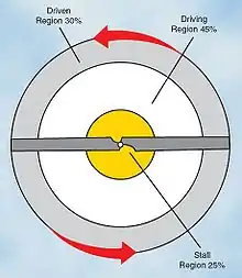 Внутрішні 25 відсотків розміру лопаті називаються зоною відривного обтікання. Ця зона діє, коли кут атаки (кут звалювання) є вищим за максимальний, спричиняючи опір, який сповільнює обертання лопаті. Стала кількість обертів ґвинта за хвилину досягається шляхом регулювання загального кута установки лопатей, так що сили провідної області, котрі прискорюють лопаті, врівноважуються з уповільнюючими силами з двох інших зон.