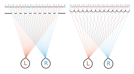 Принцип заснований на перекритті різних ділянок зображення ґратками з вузьких непрозорих смуг при розгляданні об'єктів з різних точок. При цьому зображення стереопари складаються зі смуг, що чергуються одна за одною. В результаті, кожне око спостерігача бачить через щілини в гратці тільки смуги визначеної для нього частини стереопари, тоді як сусідні смуги закриті растром.
