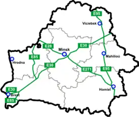 | M1 E30 | Берестя (Козловичи) — Мінськ — кордон Російської Федерації (Редьки) | 610 |