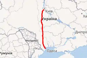 Починається в Києві, проходить через Білу Церкву, Жашків, Умань та закінчується в Одесі.