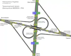 - Транспортний вузол (94 км) — перетин з автошляхом Р04 (Київ — Фастів — Біла Церква — Звенигородка).