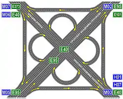 - Київ. На виїзді з Києва автошлях М05 починається від проспекту Академіка Глушкова, який є продовженням автошляху E95. Біля житлового масиву Теремки перетинає під мостом вулицю Академіка Заболотного (кільцева дорога), який є продовженням автошляху E40.